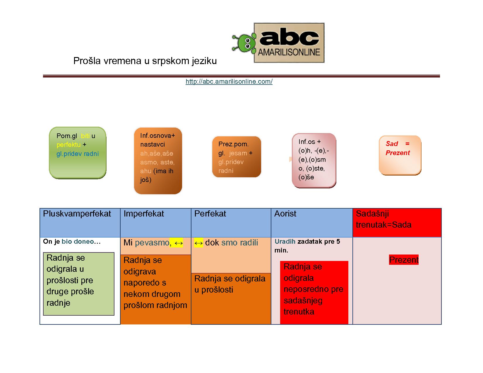 Tako smo rešili da razjasnimo i lepo nacrtamo ta prošla vremena u srpskom jeziku, kako gde, naročito da ne brkamo više aorist i imperfekat. Sve to detaljnije imate u svojim knjigama, ovo je samo tabela, da se lakše zapamti.